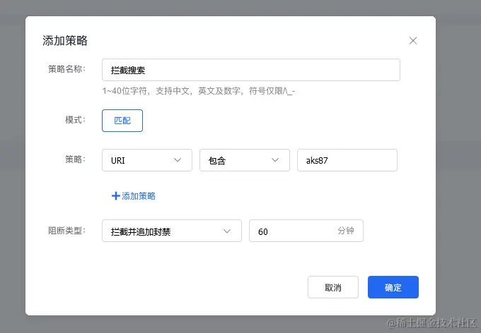 比如网址aks87,我们添加URI-包含-aks87 拦截并追加封禁,如下图: