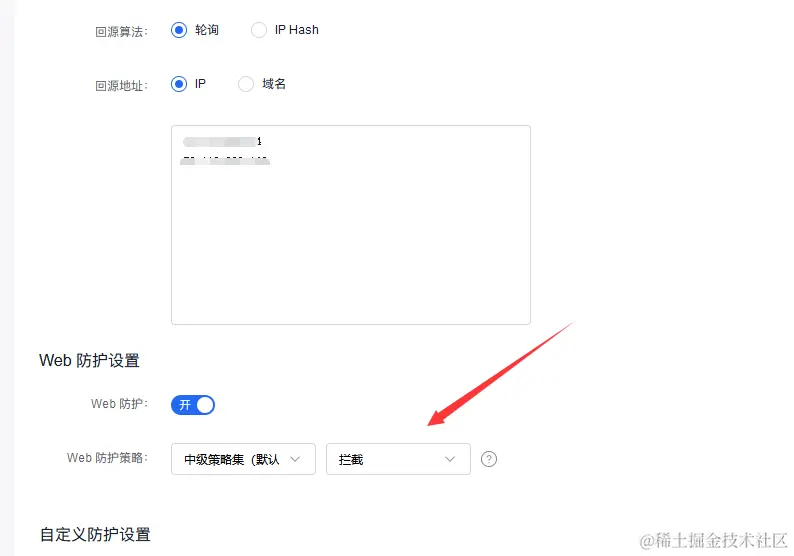 然后我们进入域名配置里开启自定义防护设置,选择刚才创建的模板。