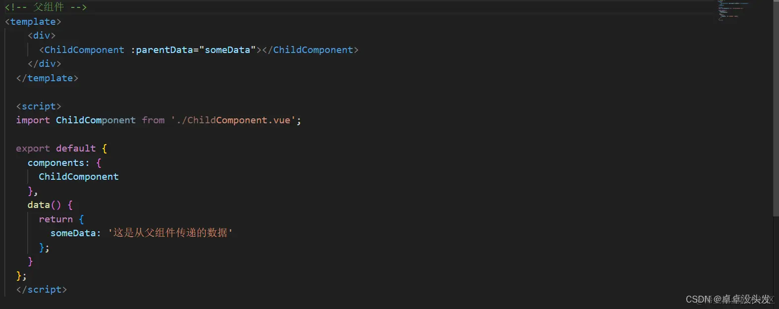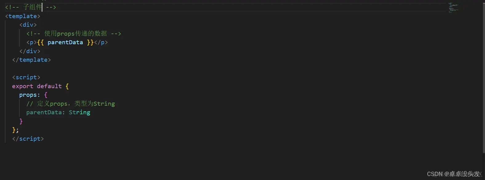 - 在父组件的模板中,你可以通过带有属性的标签来使用子组件,属性的值就是传递给子组件的数据。