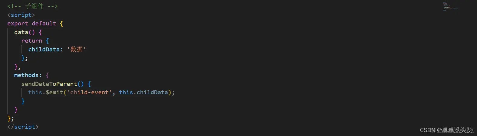 讲人话,父传子用在子组件用props接受,子传父在子组件中用$emit发送(‘a’,‘b’),并且在父组件中接受