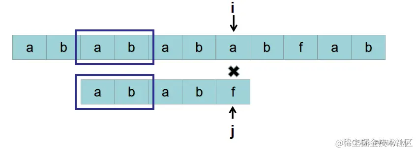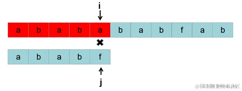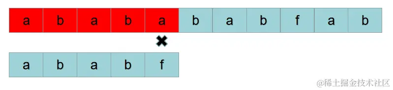 按照暴力的思路,接下来用 S[2] 开头的子串: P = “ababa“ 与 P = “ababf“ 比较。