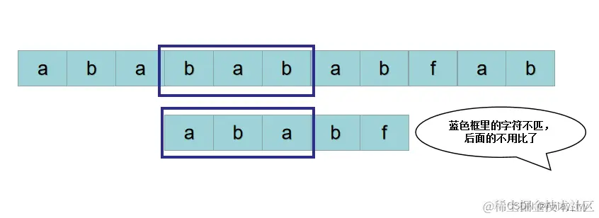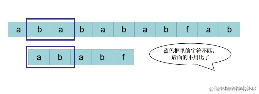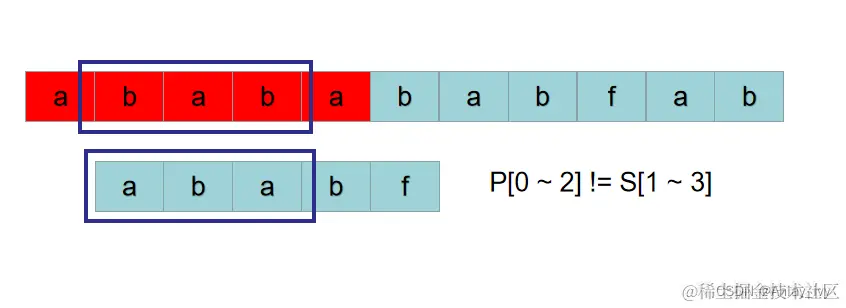 按照暴力的思路,接下来用 S[3] 开头的子串: P = “babab“ 与 P = “ababf“ 比较。