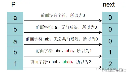 - P[2] 前面的字符串为:ab,它的前缀为:a,后缀为b。前缀不等于后缀,所以没有公共前后缀,最长公共前后缀长度为 0。