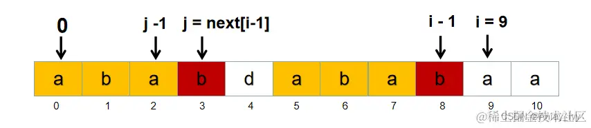 在求 next[10] 的时候就是这种情况,如下图: