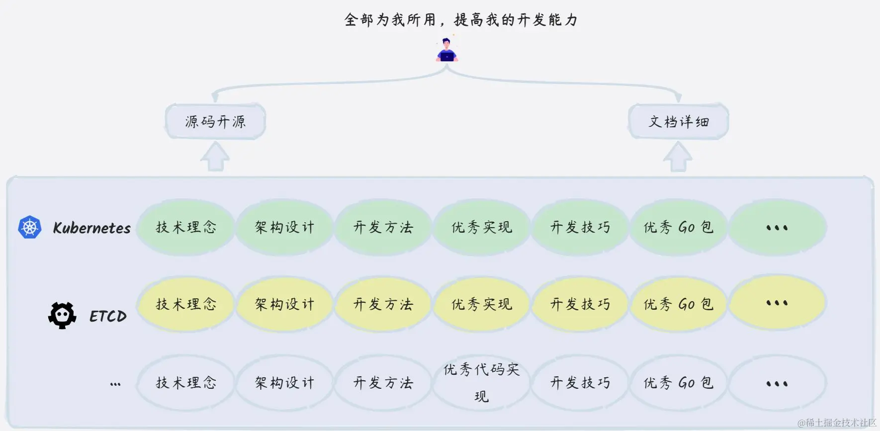 云原生中包含了大量的技术理念、架构设计、开发方法、优秀代码实现、开发技巧、优秀 Go 包等。例如,我们平时在做业务开发的过程中,遇到各种功能,基本都能在 Kubernetes 中找到现成的实现。围绕着 Kubernetes 也有很多优秀的开源项目,这些开源项目也有自己优秀的技术理念、架构设计、开发方法等。
