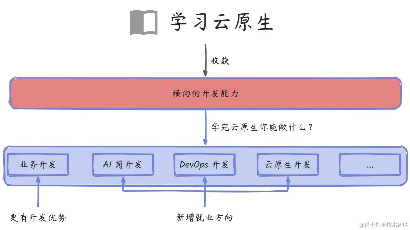 所以,不管你未来从不从事云原生相关的岗位,学习云原生技术也是非常值得的。因为,你学习云原生,其实是在学习开发技术、架构能力,而这种能力是横向的,可以应用于各种场景。对于业务开发而言,你掌握了云原生中的开发技术,你已经在竞争中胜出了。
