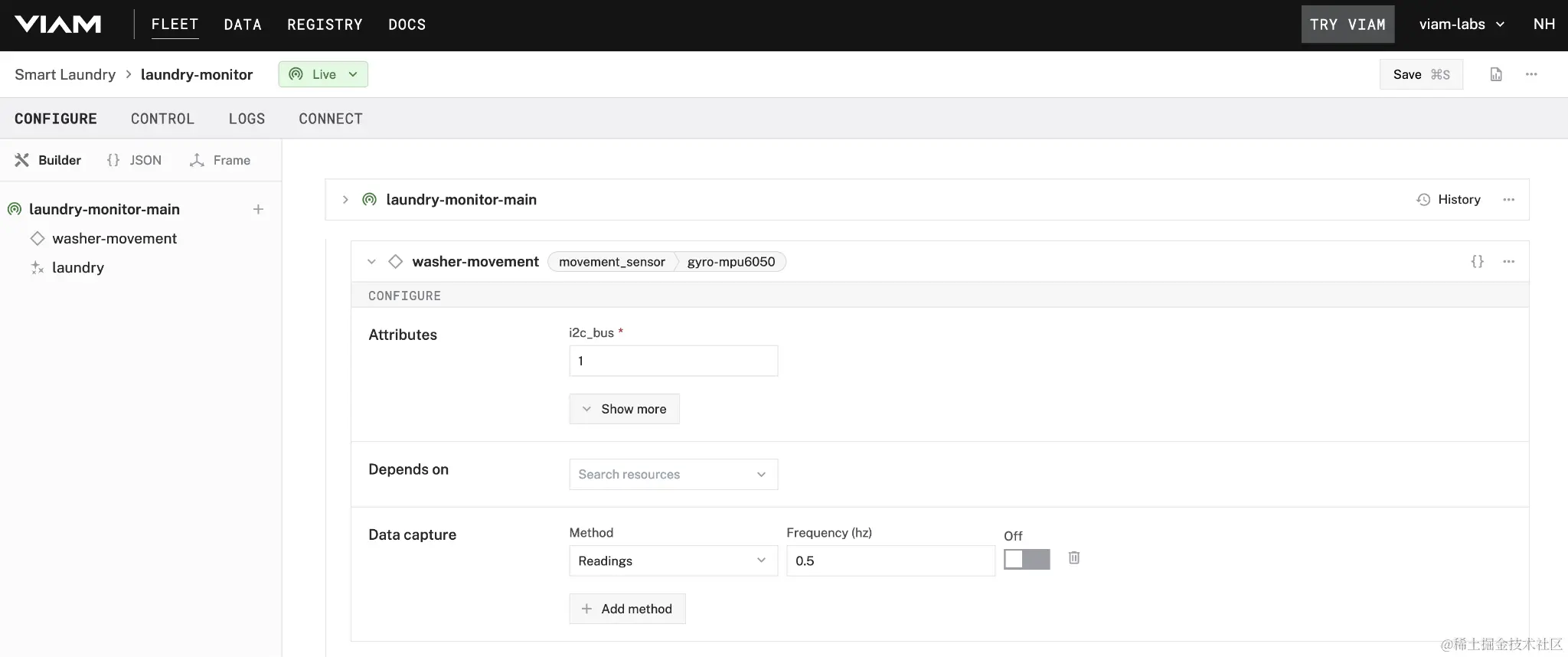 为了展示如何在这些关键领域进行改进,我将使用 Viam 设置一台智能机器来捕获运动传感器数据,我正在收集这些数据来分析我家洗衣机的工况,随着洗衣机的老化,它们遇到了问题。Viam 是一个平台,它通过其云服务和开源软件帮助缩小硬件和软件之间的差距。