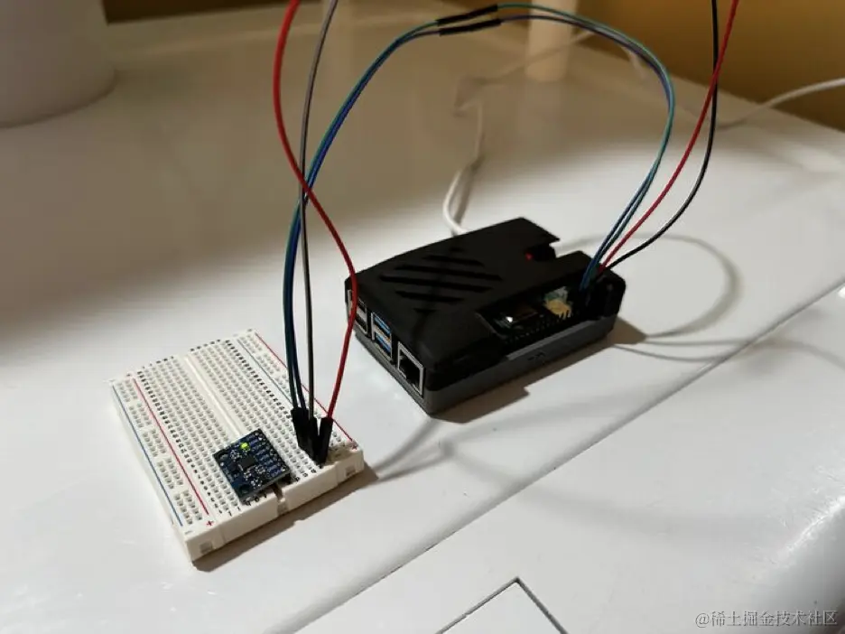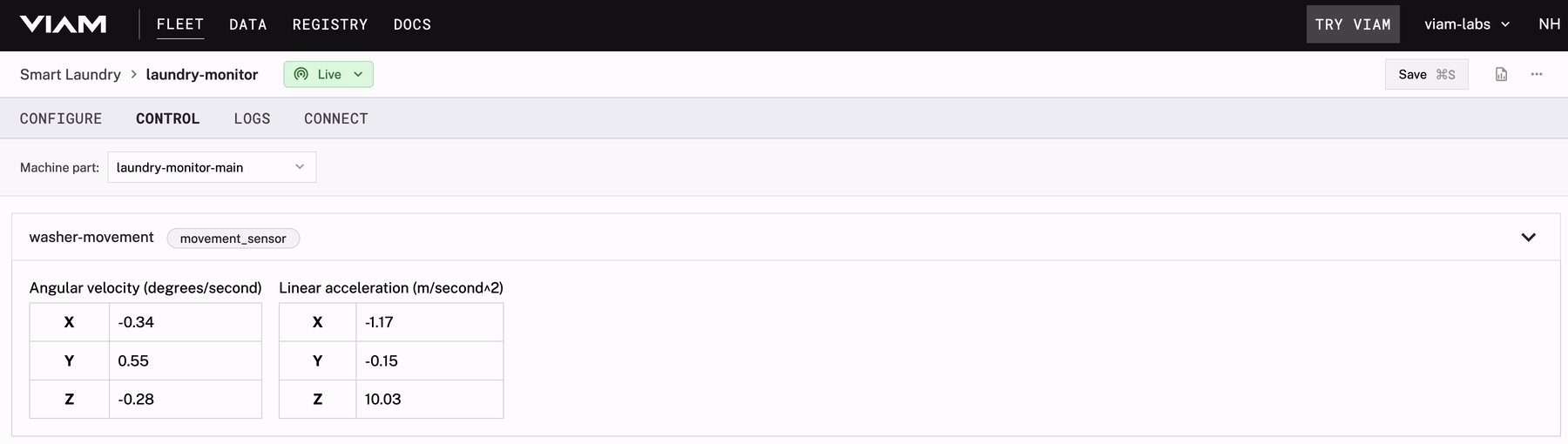 对于我的项目,我选择了一个我手头已经有的 Raspberry Pi 4B 和一个 MPU-6050 组合陀螺仪和加速度计分线传感器,以获取多个不同的数据点。由于 Raspbian(Raspberry Pi 的 Debian 发行版)已经在我的 Pi 上运行,并且已经连接到我的本地网络,我在 Viam 中创建了一台新机器,并按照 文档 安装了 viam-server 和我的连接配置。我的 Pi 连接到 Viam 后,我将我的运动传感器连接到主 I2C 引脚,并 将运动传感器添加到应用程序中的机器配置。现在,设备已准备好部署到我的洗衣房并开始捕获传感器数据!