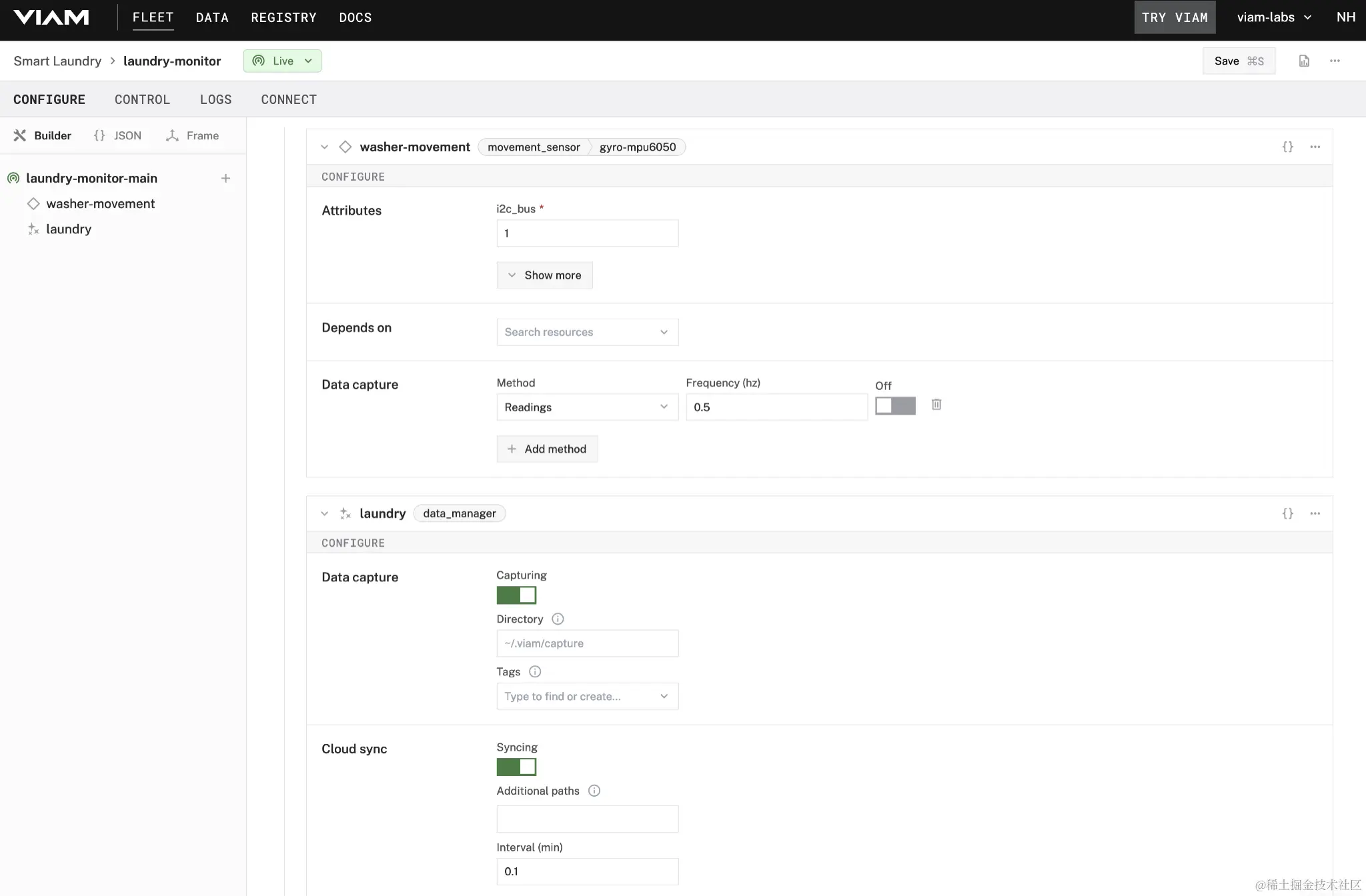 现在,我对传感器将获取的数据有了很好的了解,我想开始实际保存这些数据以供以后分析和实验。我将 Viam 数据管理服务 添加到了我的机器配置中,这将允许我控制传感器数据在设备上的存储位置、应用于数据的各种标签以及同步到云端的频率。