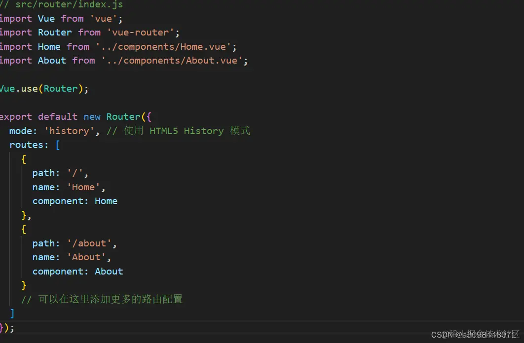 这一步我们一般是在src文件夹下创建一个router文件夹,然后在里面创建一个.js文件,在此文件下输入类似上图的操作