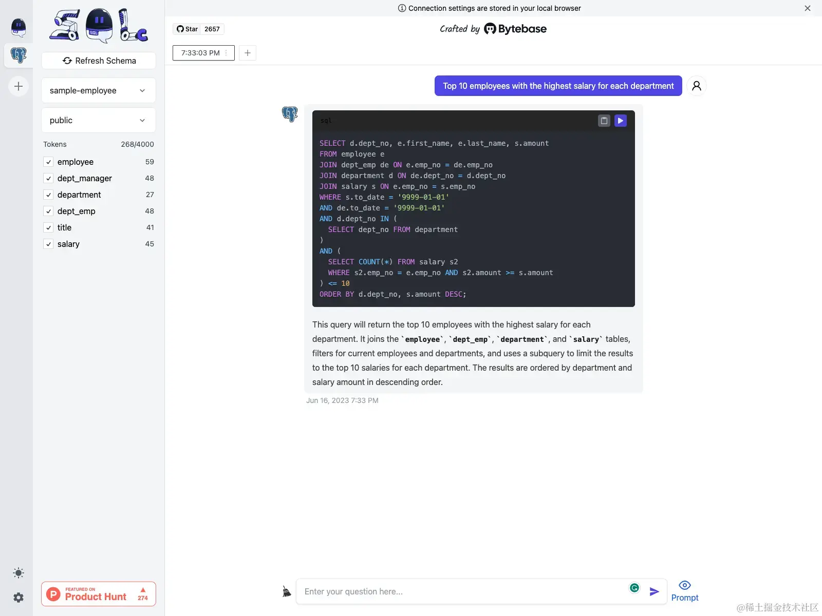 在对话框中输入“Top 10 employees with the highest salary for each department”