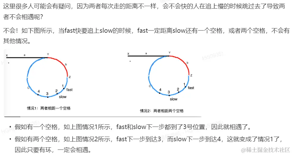 - 在链表存在环的情况下,为什么快慢指针一定会相遇?