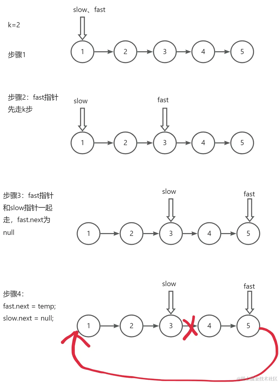 // 当fast到尾结点时,slow刚好在倒数第k个位置上