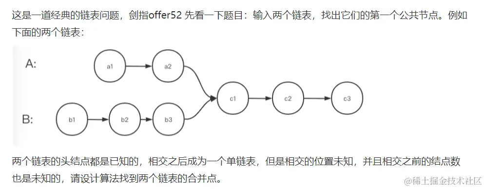 第一次遍历两个链表,算出两个链表的长度以及长链表比短链表多出若干节点?