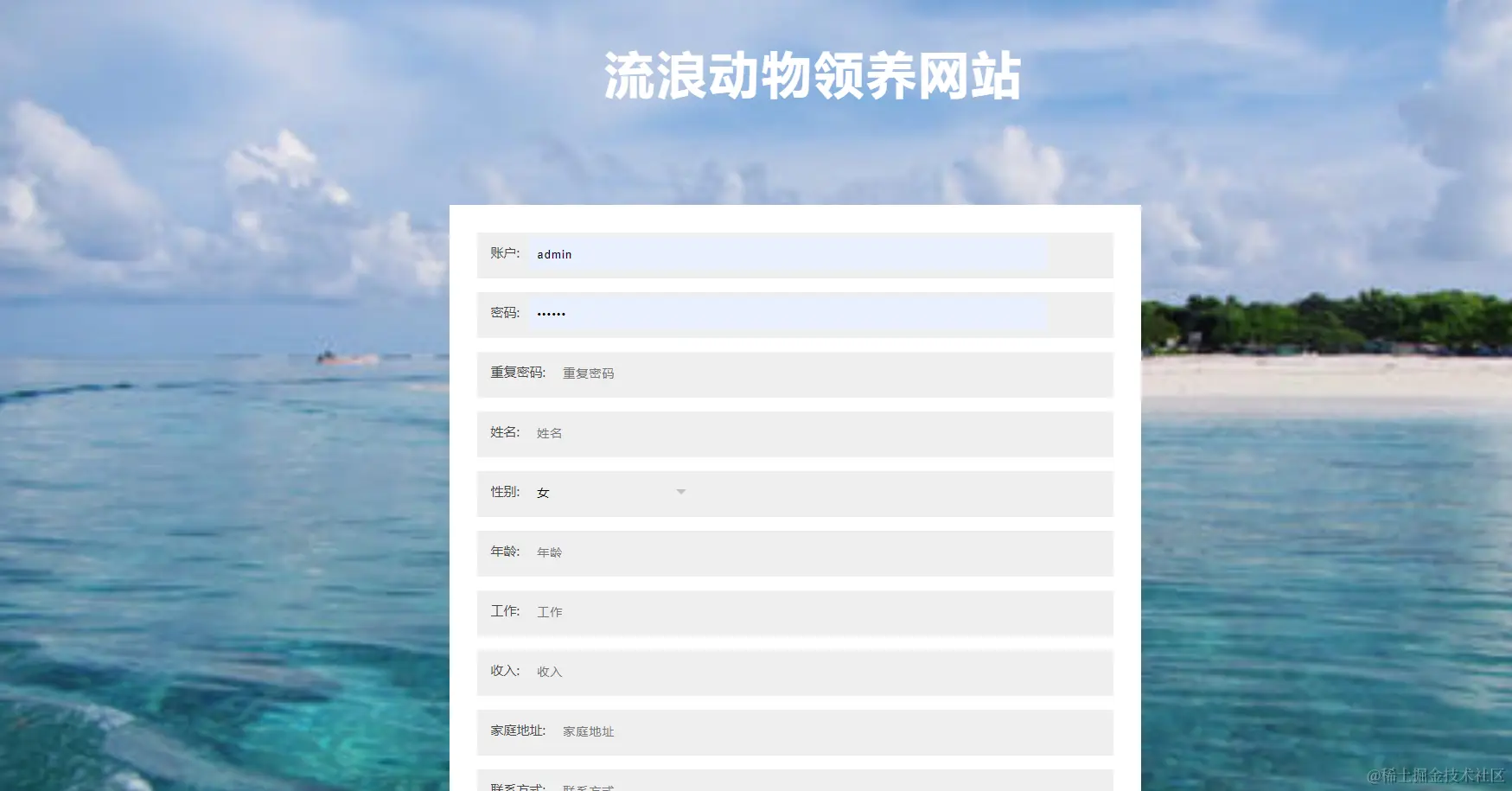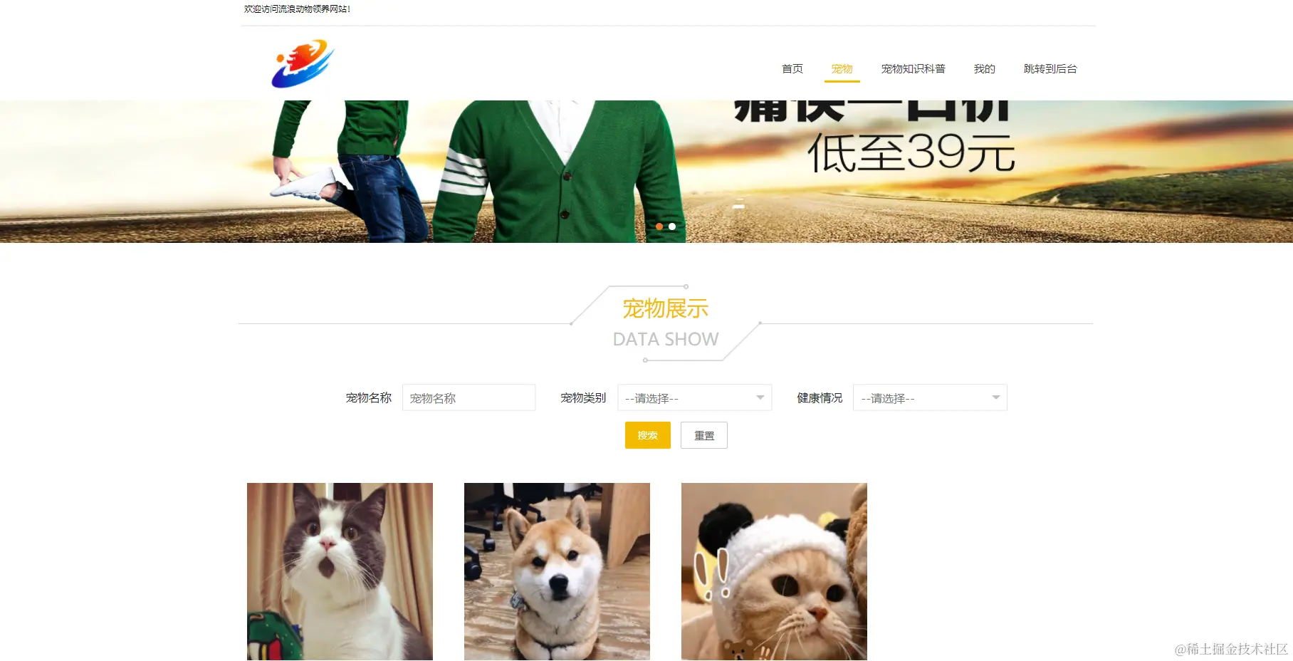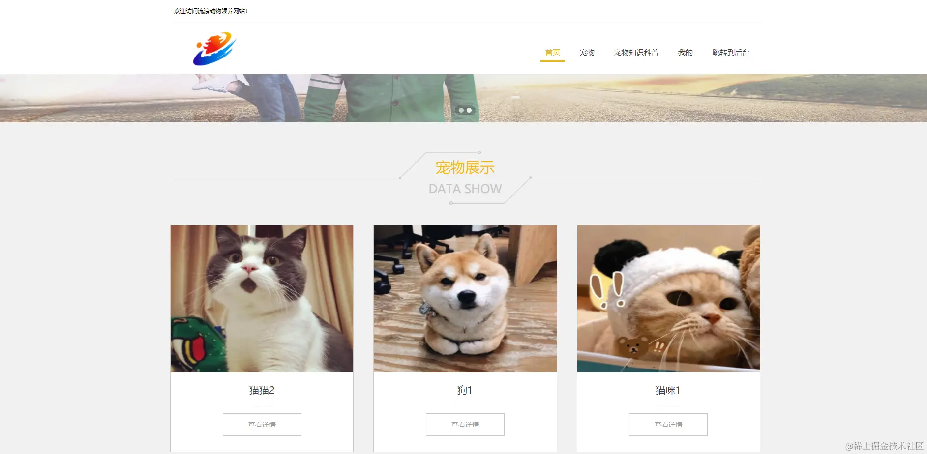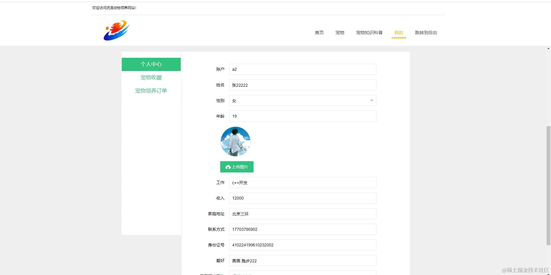 流浪动物领养网站,在流浪动物领养网站可以查看宠物信息、我的、跳转到后台等内容,如图5-17所示。