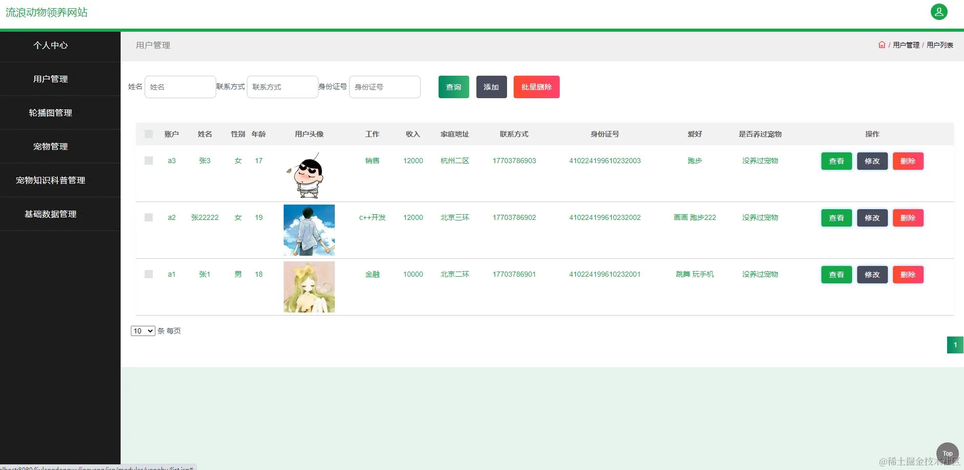 如图5.3显示的就是宠物管理页面,此页面提供给管理员的功能有:新增宠物,修改宠物,删除宠物。