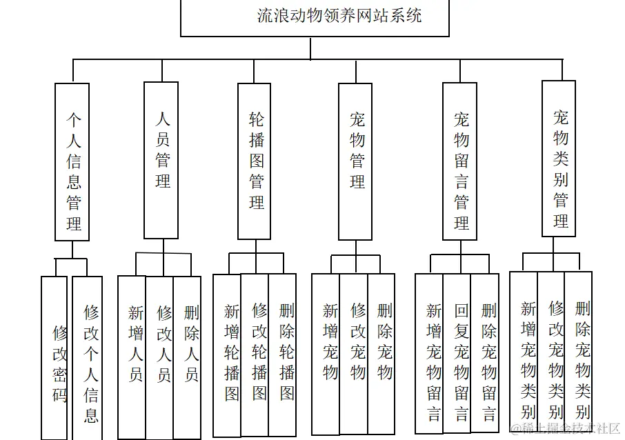 在分析并得出使用者对程序的功能要求时,就可以进行程序设计了。如图4.2展示的就是管理员功能结构图,管理员主要负责填充宠物和其类别信息,并对已填充的数据进行维护,包括修改与删除,管理员也需要对留言,订单,收藏,轮播图,基础数据管理等。