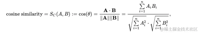 向量的相似性通常通过计算两个向量之间的距离来确定。计算相似度分数的常用方法是 余弦相似度, 其数学定义与公式如下: