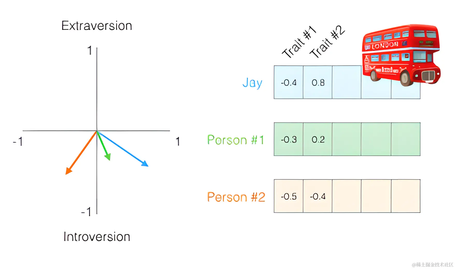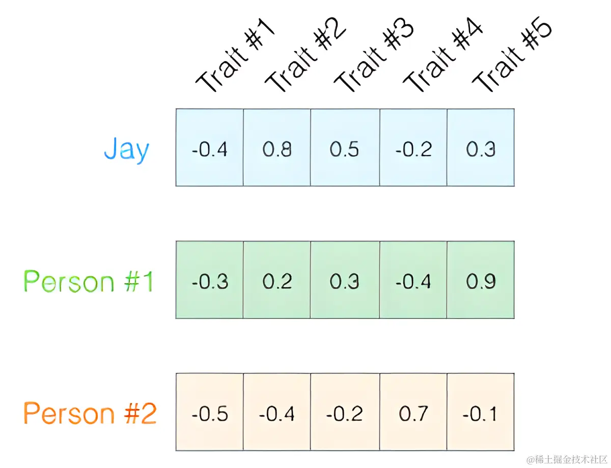 如果Jay被车撞了,我们需要通过向量搜索找到一个与其性格相似的人去代替,那么上图中哪个人与Jay相似? 机器如何识别呢?这时向量的表示法就可以让我们通过数学方式计算向量的相似性,来找到了性格相似的人。
