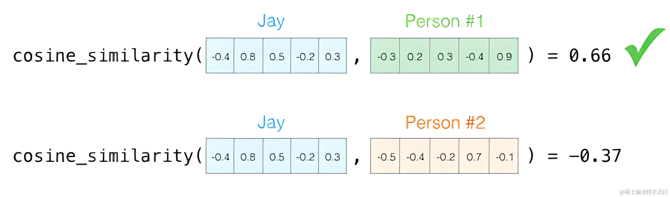 按照数学公式我们可以计算出Person #1 和Jay相似度最高,两个向量的夹角也最小,因此他们更相似: