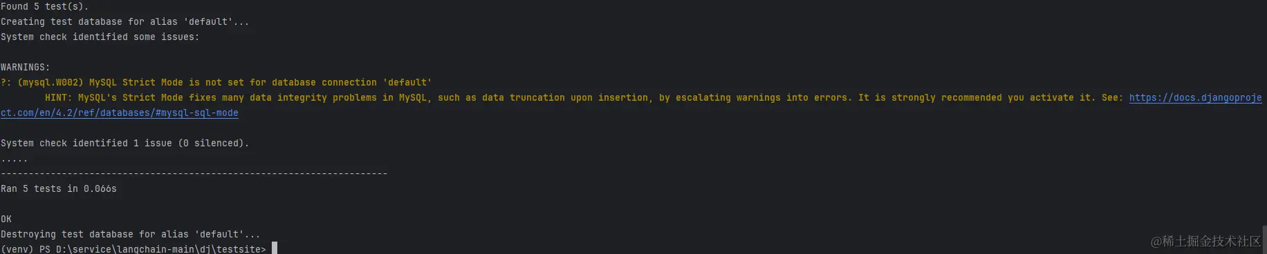 请注意,此方法不会设置测试数据库,因此以下内容将针对现有数据库运行,并且输出可能会略有不同,具体取决于已创建的问题。