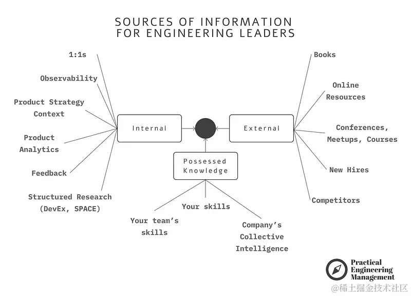 工程领导者的信息信号 -- 知识来源可分为三类:拥有的知识(你已经知道的)、外部来源(在公司外部可以观察到的)和内部信号(公司的数据、洞察力、仪表盘)。作为工程领导者,你的任务是:a)为捕捉内部信号奠定坚实的基础;b)利用这些数据推动决策和长期战略。