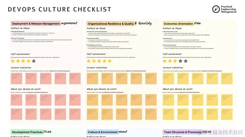 如果想对 DevOps 文化进行全面自我评估,以便更轻松的制定工程战略,建议查看 Practical Engineering Management 上的资料和模板:DevOps 文化清单。