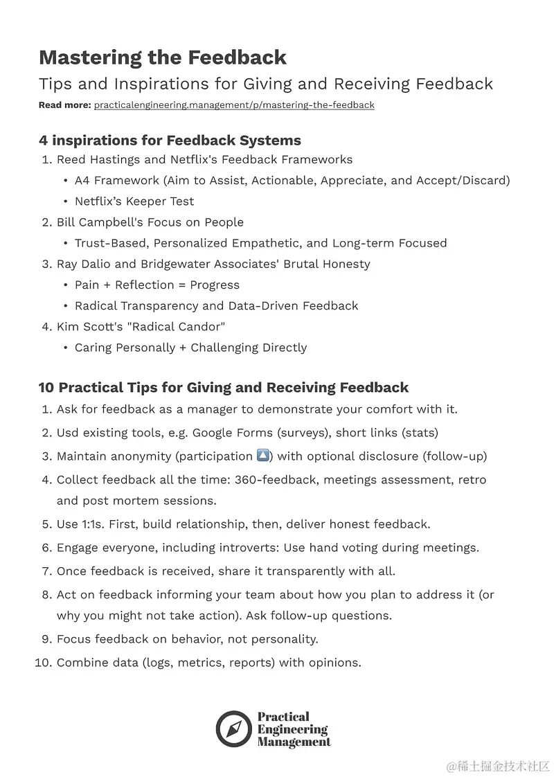 掌握反馈 -- 反馈是一种特殊的知识来源,其并不总是经验事实,而往往只是意见、信念和个人看法。尽管这些信息并不总是量化的,但往往与遥测数据和产品仪表盘上的数据一样具有洞察力。如果没有收到反馈,并不意味着没有什么需要改变的,也许只是意味着没有与你分享的空间。作为工程领导者,必须在给予和接受反馈这两方面都游刃有余。