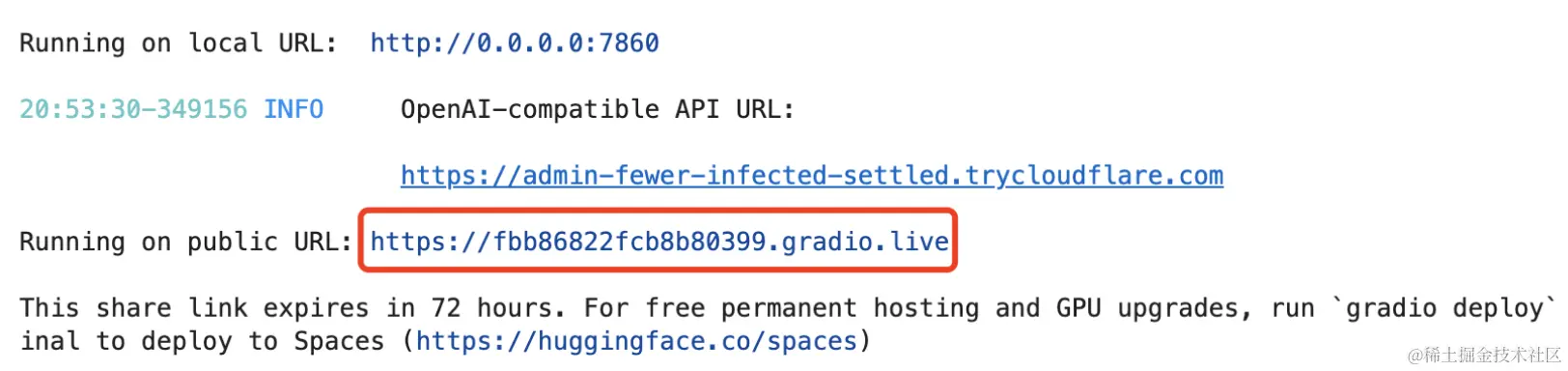 启动成功后,我们可以看到一个Gradio的链接,点击就会在浏览器打开 Text Generation WebUI。