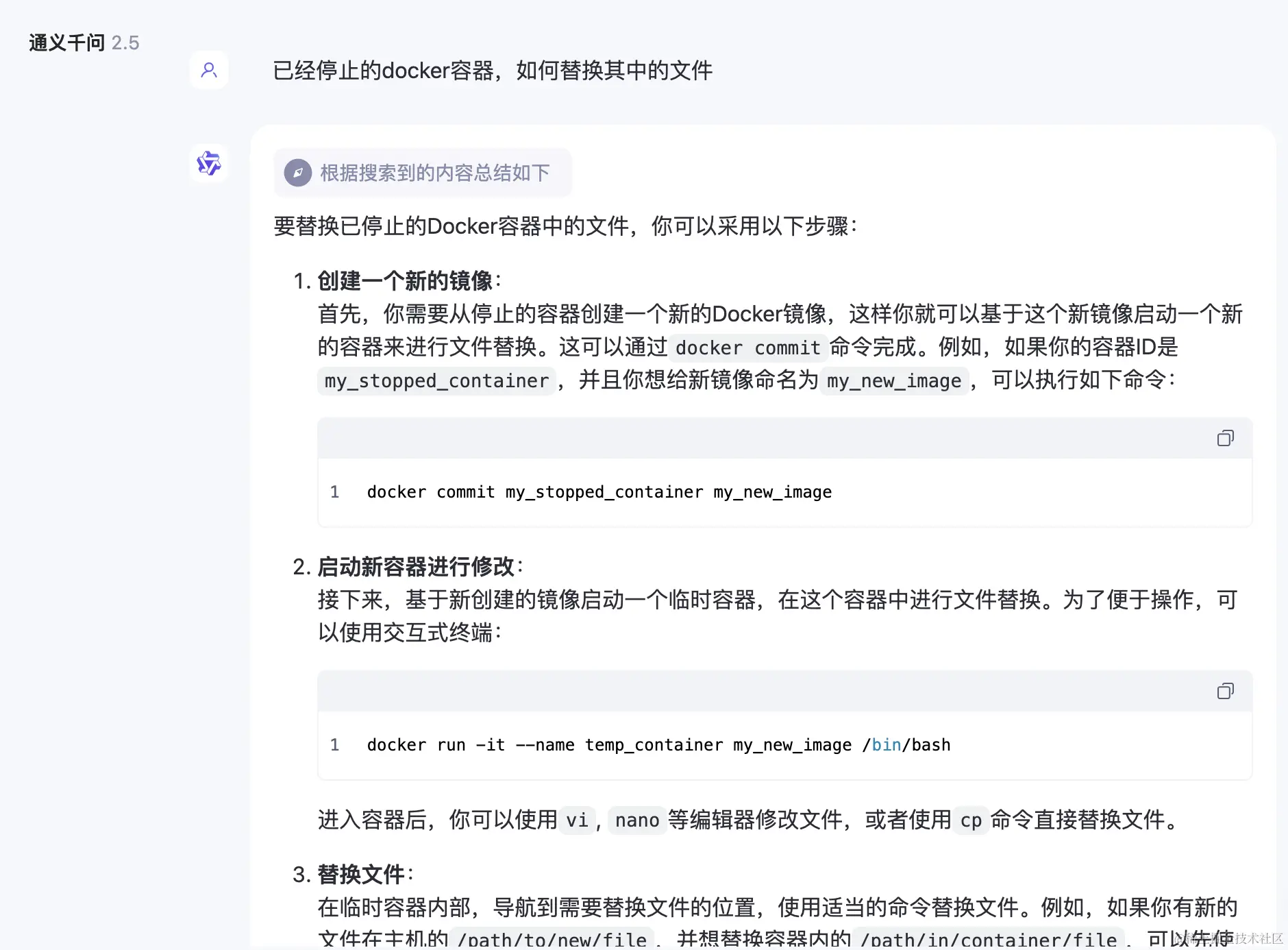 当然我也没在问题中提到我的容器启动不起来了。但是如果容器能启动起来,大模型也没要让我绕这么大的弯子,我直接启动后修改其中的文件不就行了吗?还要创建镜像后再启动一个新实例进行修改?通义千问无疑没理解到位,或者把简单的问题搞复杂了。现在通义千问回答问题时会列出几个参考网页,不知道是不是以为参考的文章质量不够导致的,很多人都诟病简体中文的语料太差,难道我不经意间就成了受害者?