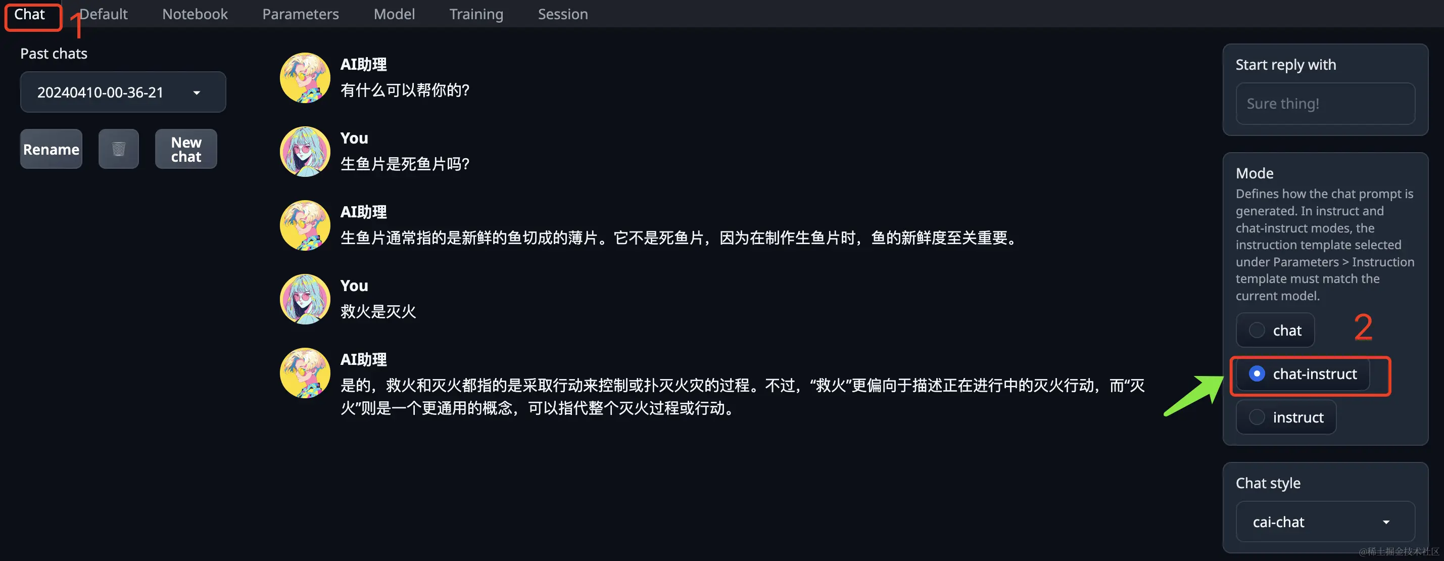 在聊天(Chat)页签的右侧,有一个“Mode”,定义了大模型处理提示词的模式,需要选择“chat-instruct”。
