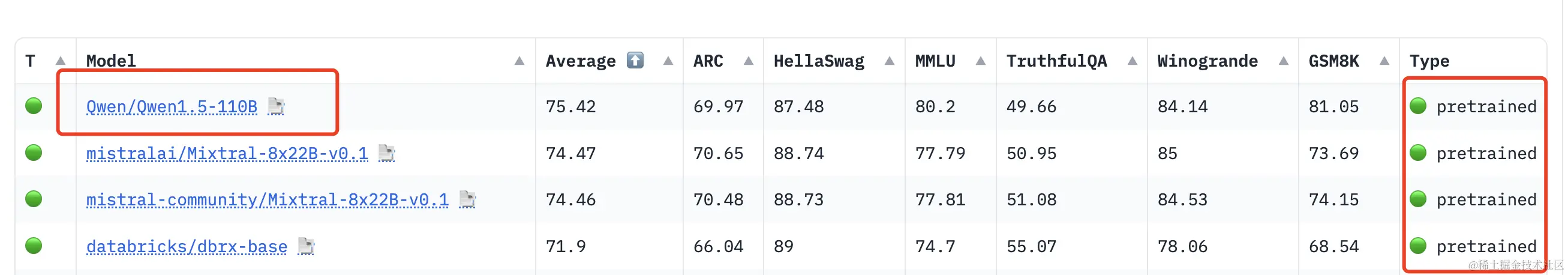 然后我又看了一下开源模型的榜单,比较能打的是 Qwen1.5-110B-Chat,在HuggingFace的千亿预训练模型的对比中排名第一,可以说在开源大模型中,通义千问确实很能打。不过 Qwen1.5-110B 发布的比较早,发布时间是两个月之前,也不是当前的通义千问2.5。