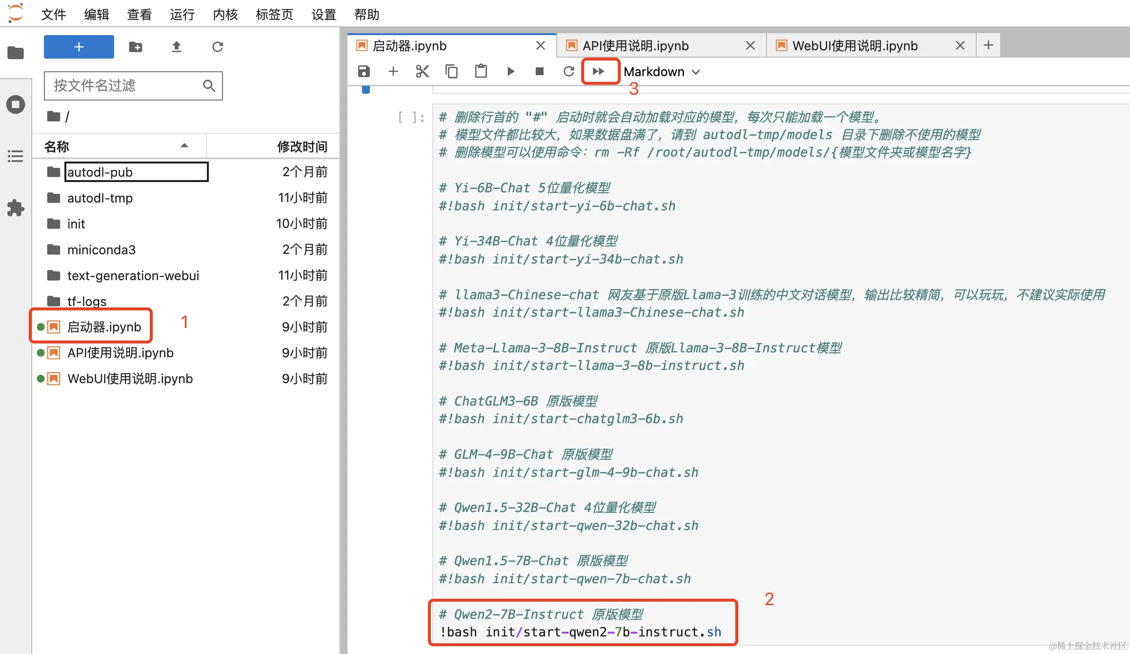 在 JupyterLab 页面中打开“启动器”,这个镜像内置了很多模型,默认启动的是 Qwen2-7B-Instruct,这些模型在24G显存下都能跑起来。如果要运行更大参数的模型,需要更多的显存,成本比较高,有兴趣的可以尝试下。