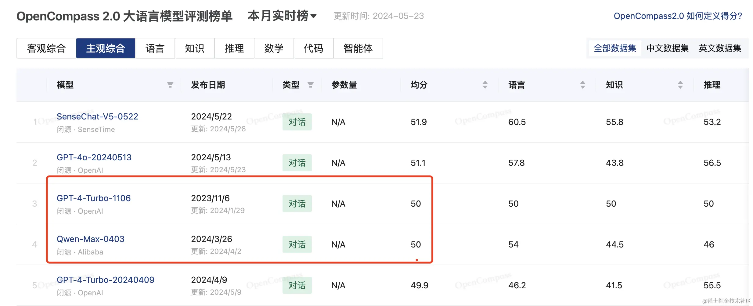不过超越GPT4这件事说起来可能还是有点勉强,很多媒体的证据只是在 OpenCompass 榜单上的一个主观综合评测得分,Qwen-Max-0403 的得分追平 GPT-4-Turbo-1106。主观综合的评测采用了真实人类的评测结果,Qwen-Max-0403 是通义千问的千亿参数大模型,是闭源的,是4月3号的版本,最新的Qwen-Max是4月28号的版本,是通义千问2.5底层的API模型。一般来说新版本会比旧版本强,所以得出通义千问2.5超越GPT4的结论。