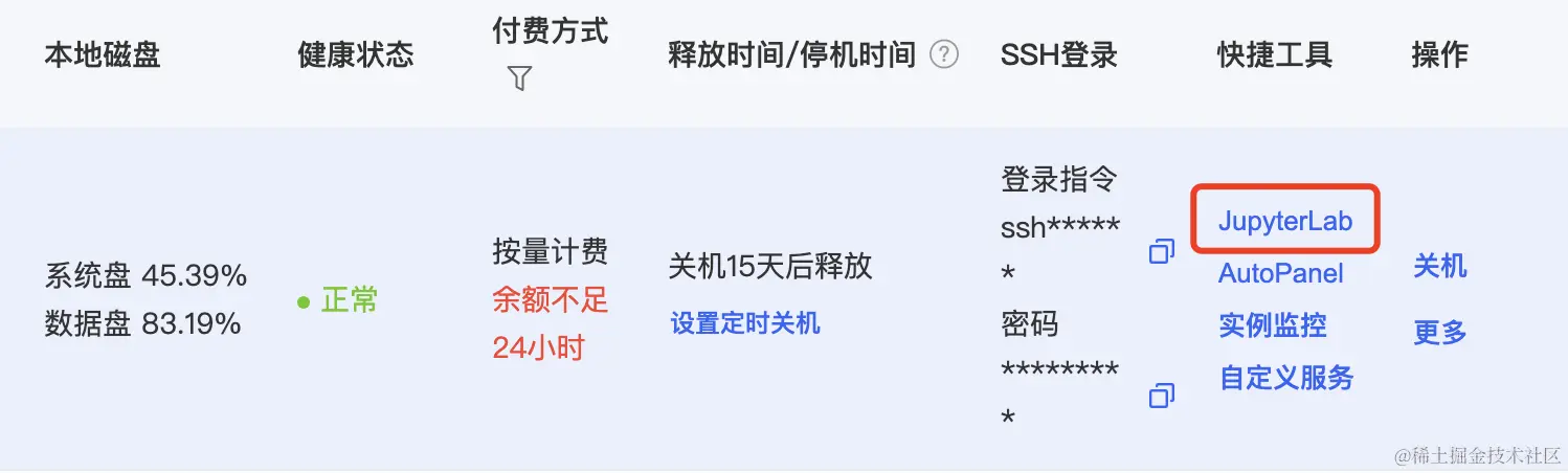实例启动后,在服务器实例列表中点击“JupyterLab”,进入一个Web页面。