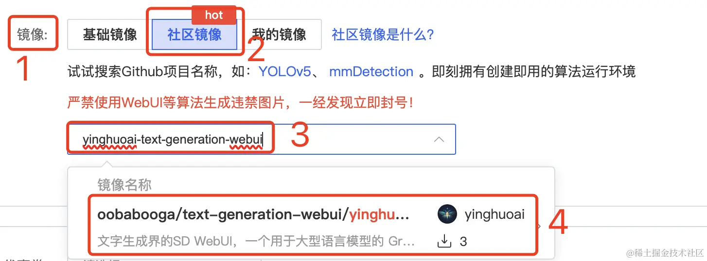 或者你也可以直接创建容器示例,在镜像这里选择“社区镜像”,输入 yinghuoai-text-generation-webui ,即可找到这个镜像。