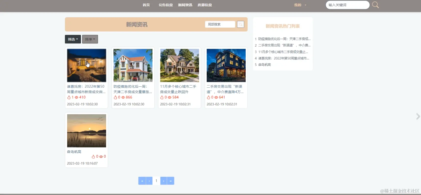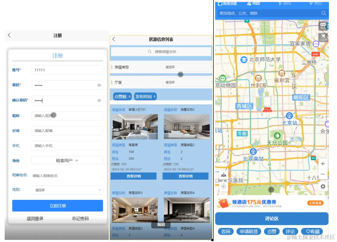 用户客户端:首页、公告信息、新闻资讯、房源信息等功能。