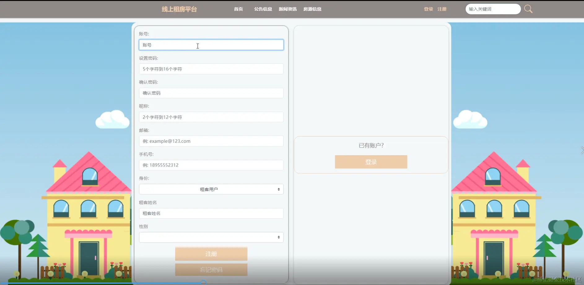 用户登录或注册在登陆页面填写账号、密码、邮箱、手机昵称、姓名等信息