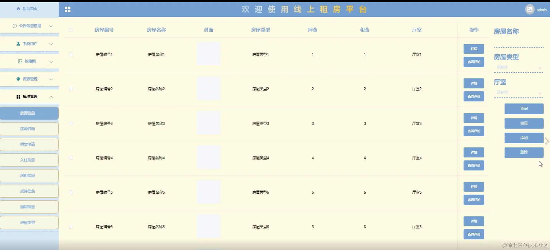 系统功能包括管理员服务端:首页、轮播图管理、公告信息管理、系统用户(管理员、租客用户、房主用户)资源管理(新闻列表、新闻分类列表)模块管理(房源信息、房源咨询、租赁申请、入住信息、房租信息、反馈信息、通知信息、房屋类型)个人管理;