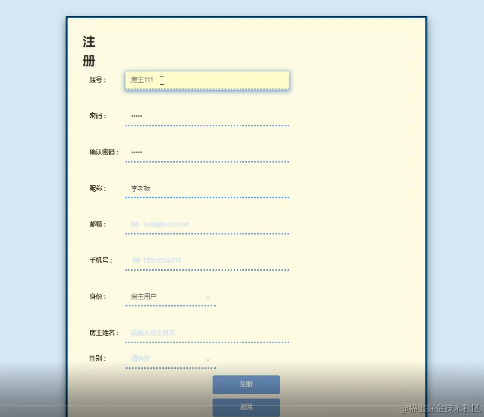 用户注册在登陆页面填写账号、密码、邮箱、手机昵称、姓名等信息