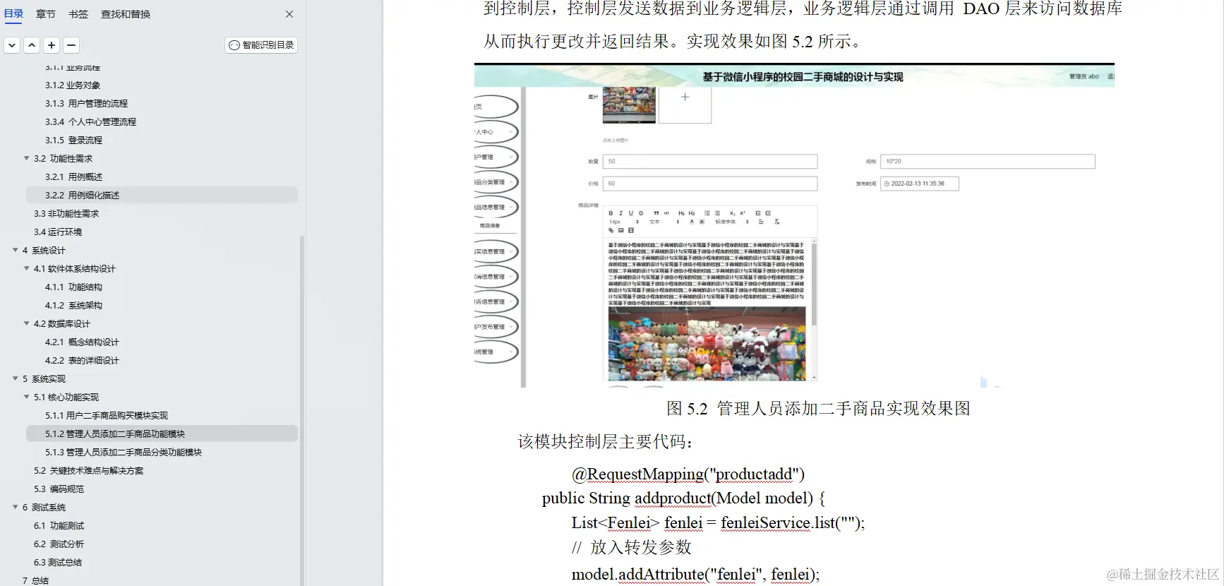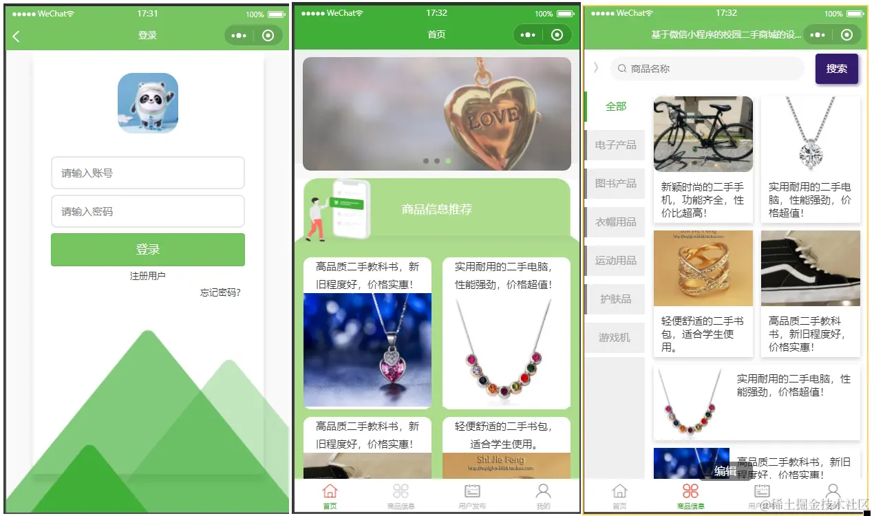在校园二手商城小程序中,核心业务用例的实现效果如下所示。受篇幅所限,介绍购买二手商品、添加二手商品和添加二手商品分类相关的三个模块核心功能。