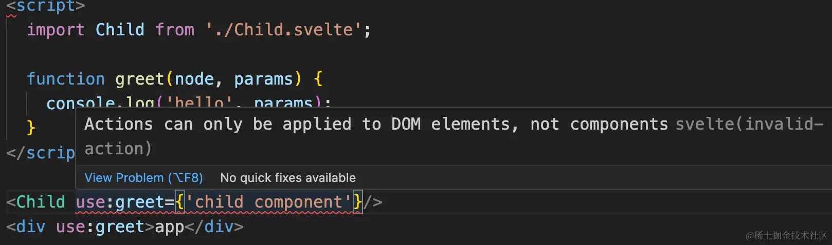 在前面介绍《插槽》的章节中,我们了解到,在Svelte中并不能劫持$$slots来二次定义插槽的内容,那我们便可以使用指令的形式来完成这一操作。