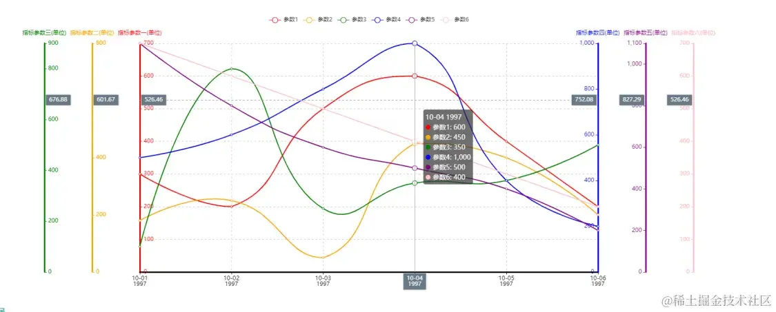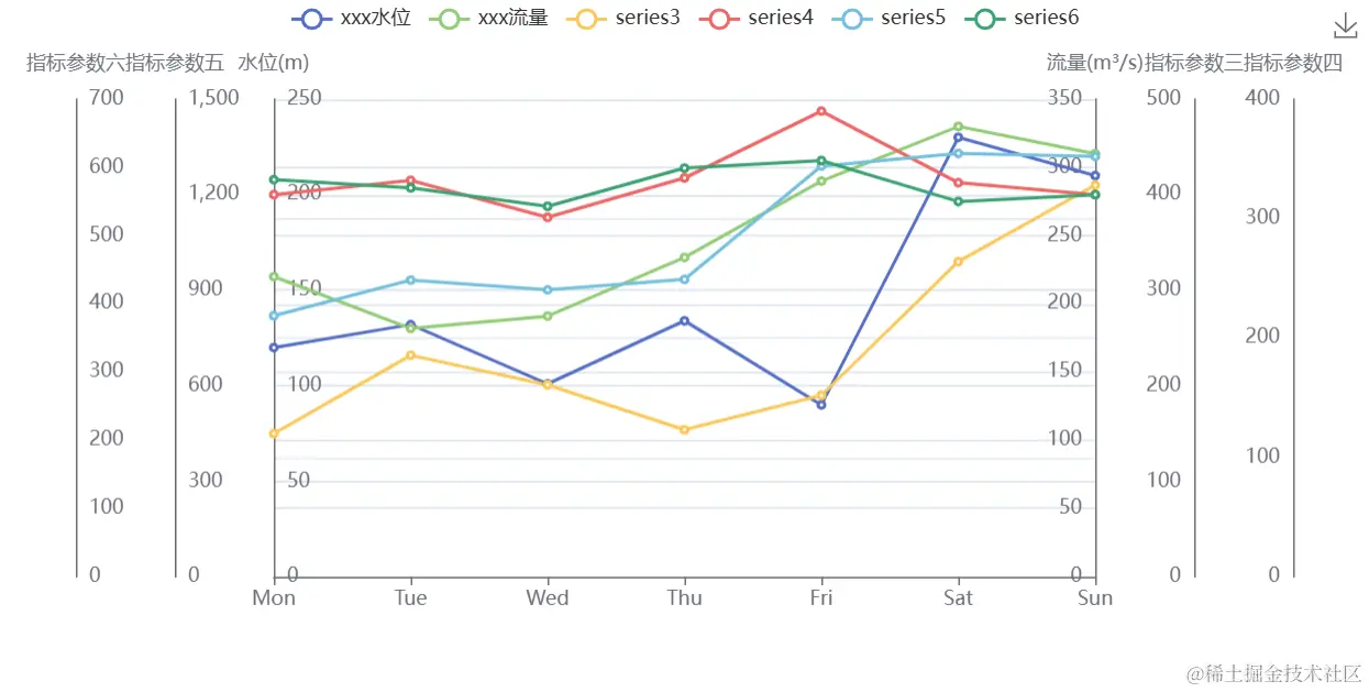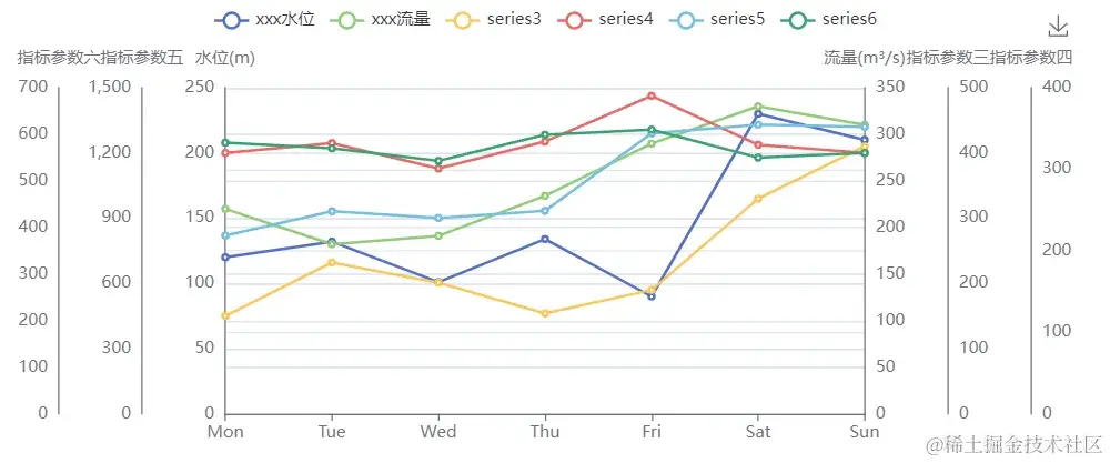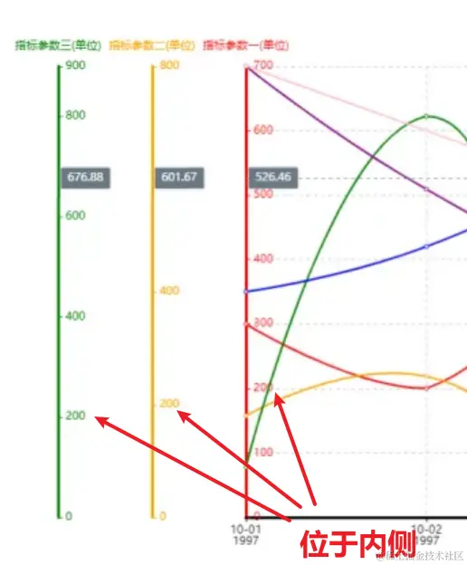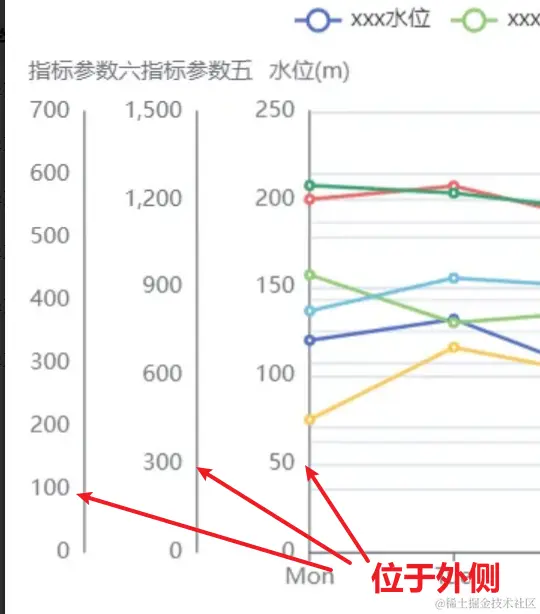 echarts学习: 将y轴刻度标签放置到轴线内侧 Carlos_sam 2024-06-11 114 阅读1分钟 前言 在上一篇文章中,我试图复现下面的这张图表。经过一番努力实现了对6条y轴的布局。 对比上面的两张图就会发现,效果图中所有y轴的刻度标签都在轴线内侧,而我的图表中y轴的刻度标签都在轴线外侧。 实现方法 这个实现起来也很简单,将yAxis.axisLabel.inside属性设置为true 就行了(axisLabel就是专门用于设置刻度标签的)