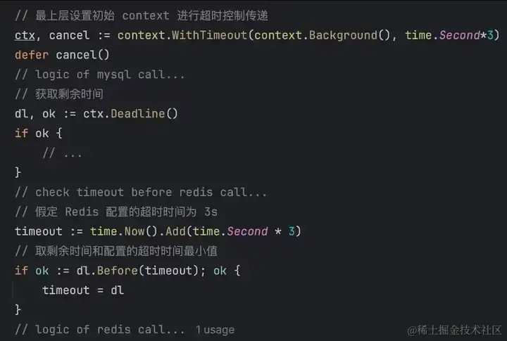 由于每个组件或服务都会在配置文件中配置固定的超时时间,使用时应该取实际剩余时间与配置的超时时间中的最小值。