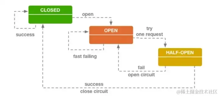 当进入 Open 状态时会拒绝所有请求;进入 Closed 状态时瞬间会有大量请求,这时服务端可能还没有完全恢复,会导致熔断器又切换到 Open 状态;而 Half-Open 状态存在的目的在于实现了服务的自我修复,同时防止正在恢复的服务再次被大量打垮;
