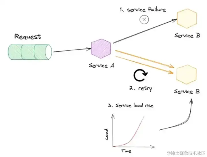 入口请求大量堆积,CPU、内存等资源被逐渐耗尽,最终导致服务宕掉。