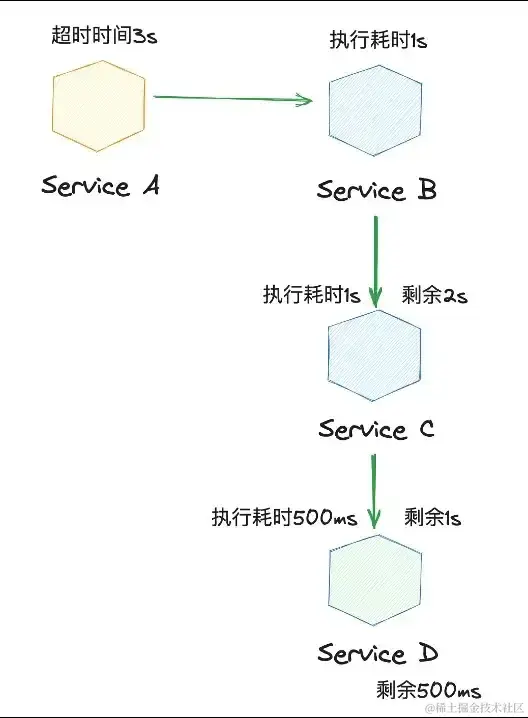一个请求可能由一系列 RPC 调用组成,每个服务在开始处理请求前应检查是否还有足够的剩余时间处理,也就是应该在每个服务间传递超时时间。
