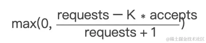 当客户端主动丢弃请求时,requests 值会一直增大,在某个时间点会超过 K∗accepts,使 p 计算出来的值大于 0,此时客户端会以此概率对请求做主动丢弃;