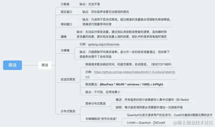这里笔者简单梳理了一张常用的限流算法的思维导图,主要阐述每个算法的局限性,需要根据实际应用场景选择合适的算法: