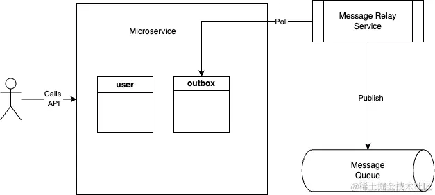 transmitting发件箱的想法是,为了避免双重写入问题,而不是写入两个不同的数据源,我们必须在单个事务中只写入一个,即我们的数据库,因此我们可以在失败的情况下将整个事务作为一个单元回滚而不会产生副作用。因此,本质上我们正在创建一个本地事务,而不是分布式事务。这样,我们将始终处于一种一致的状态。为了实现这种模式,我们必须创建一个名为outbox的新表,而不是直接写入队列,我们将在这个表中写入消息。并创建一个单独的消息中继服务(MRS),它将轮询未传递的消息并批量传递它们。从图表上看,这可以如下所示: